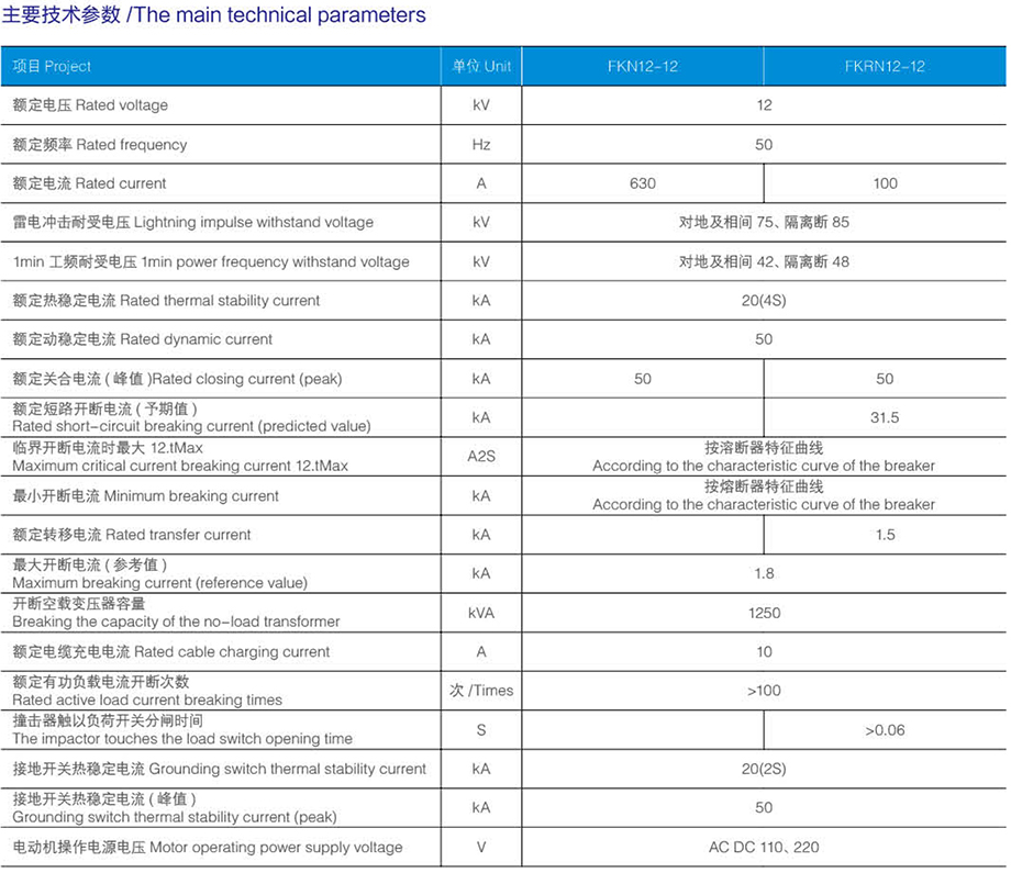 FKRN12-12 戶內(nèi)高壓負(fù)荷開關(guān)熔斷器組合電器 ( 以上簡稱 FKRN12-12 組合電器 ),是 FKN12-12 負(fù)荷開關(guān)與 SKLAJ-12(XRNTC1-10) 高壓限流熔斷器組合在一起的戶內(nèi)開關(guān)設(shè)備。它可以可靠開斷直至短路電流的任何電流;負(fù)荷開關(guān)開斷電流,熔斷器開斷短路電流,聯(lián)合開斷工作電流與全短路電流之間的任何電流,同時熔斷器通過其撞擊器使負(fù)荷開關(guān)分閘。